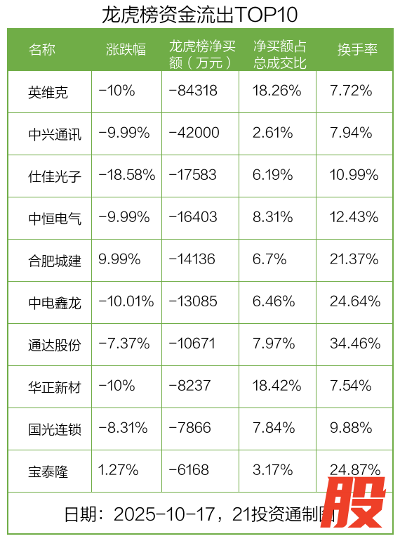 而龙虎榜中资金净流出最多的是英维克(002837.SZ),被净卖出为8.43亿元,占总成交金额的18.26%。英维克收盘下跌10%,换手率为7.72%。