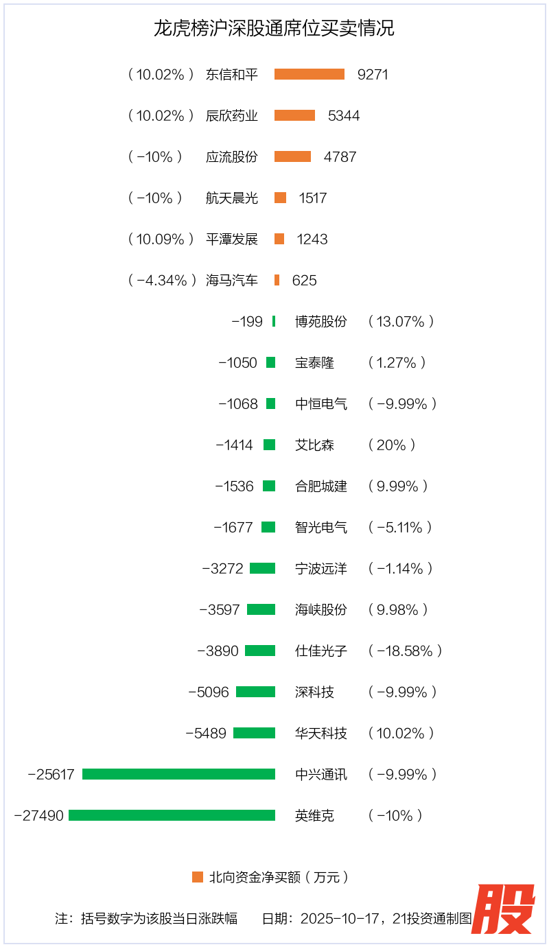 10月17日,上证指数下跌1.95%,深证成指下跌3.04%,创业板指下跌3.36%。盘后龙虎榜数据显示,共有49只个股因当日异动登上龙虎榜,资金净流入最多的是东信和平(002017.SZ),达3.64亿元。