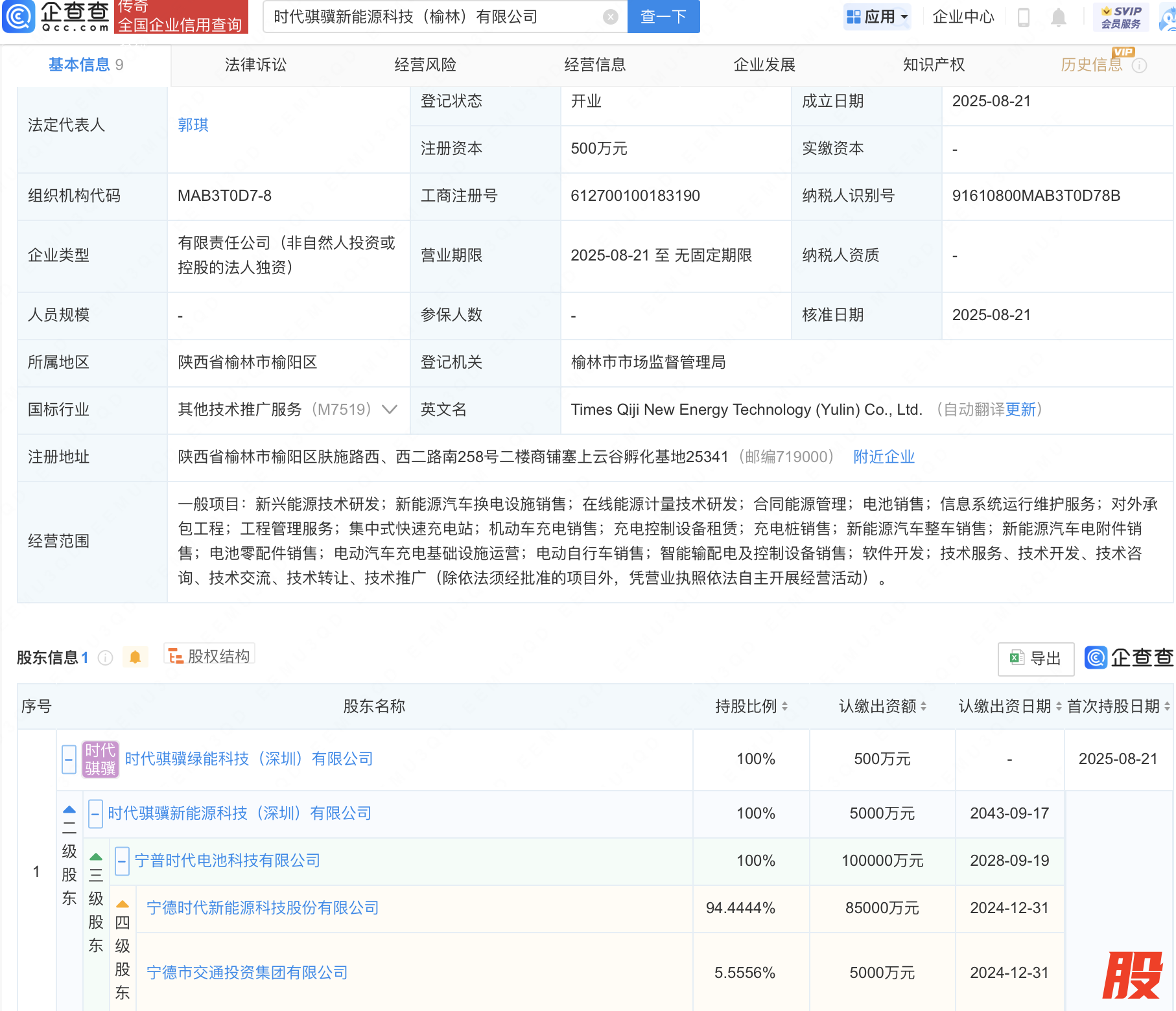 近日,时代骐骥新能源科技(榆林)有限公司成立,经营范围包含:充电控制设备租赁;充电桩销售;新能源汽车整车销售;新能源汽车电附件销售等。企查查股权穿透显示,该公司由宁德时代(300750)旗下时代骐骥绿能科技(深圳)有限公司全资持股。
