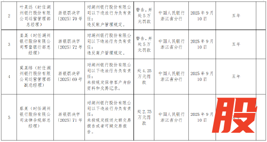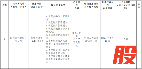 9月19日金融一线消息,中国人民银行浙江省分行行政处罚决定信息公示表显示,湖州银行因8项违法行为,被中国人民银行浙江省分行警告,并处427.05万元罚款。该行的违法行为类型如下:违反金融统计管理规定;违反账户管理规定;违反商户管理规定;违反反假货币业务管理规定;占压财政存款或者资金;违反信用信息采集、提供、查询及相关管理规定;未按规定保存客户身份资料和交易记录;未按规定报送大额交易报告或者可疑交易报告。